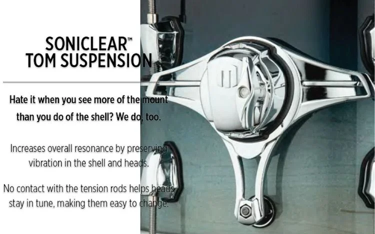 - Tone-enhancing SONIClear tom hardware lets shells and heads ring true to their fullest potential without hindrance